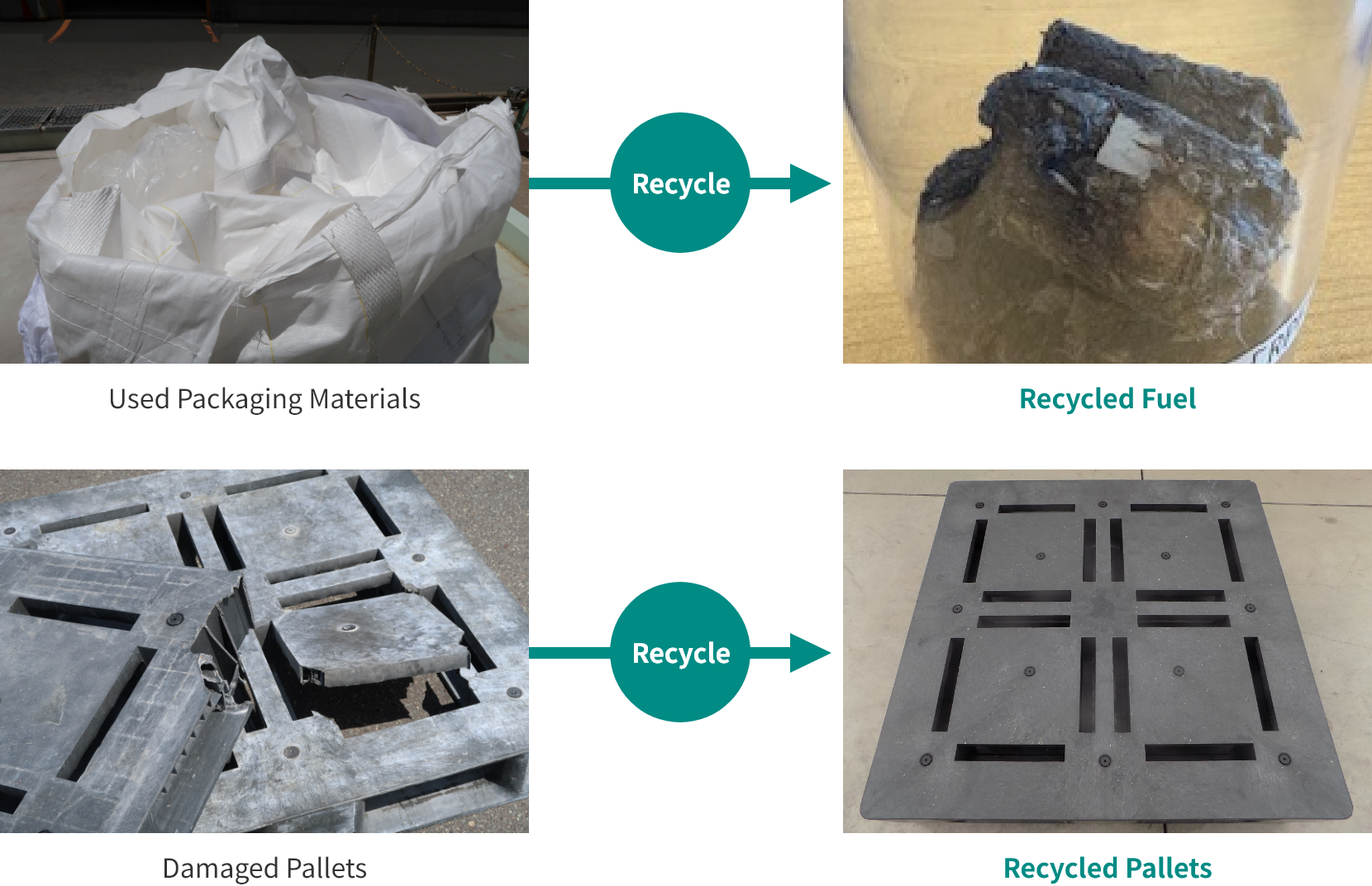 Used packaging materials and pellets are recycled.