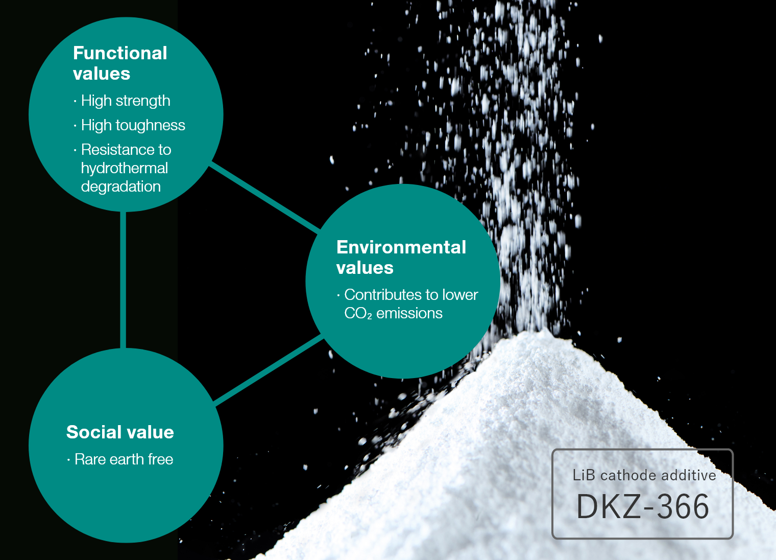 The DKK Group contributes to a sustainable society through the supply of “Valuable Products.” The “value” of “Valuable Products” is not limited to their functionality. Although not well known, Zirconia is a rare material that adds value to lithium-ion batteries (LiBs) beyond functionality, such as creating high levels of safety (“social value”) and reducing waste due to extending battery life (“environmental value”). Its use as an additive or surface treatment for LiB cathode materials reduces electrolyte decomposition and cathode component dissolution, which are causes of degradation. Its effectiveness has attracted strong praise, and it has been used by cathode material manufacturers for a long time. The electrification of vehicles in recent years means cathode materials are required to have even higher functionality in order to realize space-saving, high-capacity batteries. At the same time, pairing battery safety and service life has become an important issue, as reported in the media.