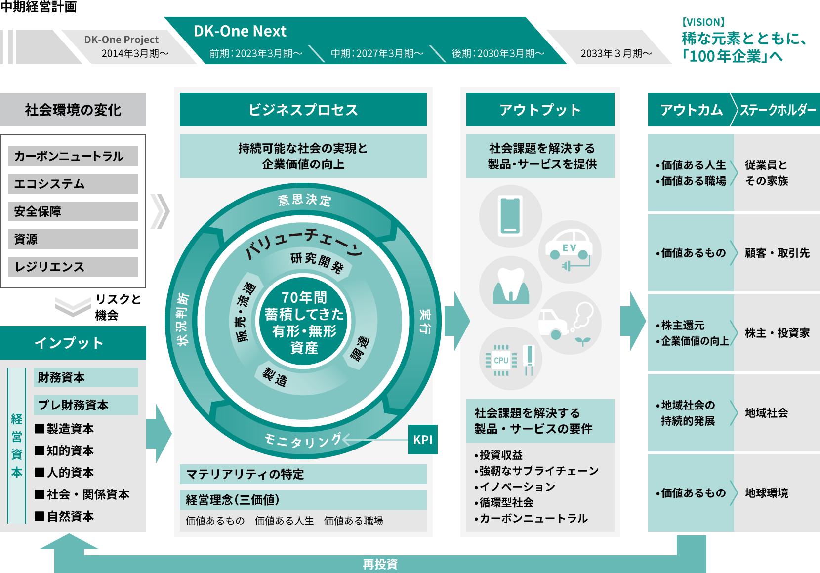 環境に優しく快適な社会の実現に向け、稀な元素「ジルコニウム」で社会課題を解決する製品・サービスを提供し続けることが、当社グループの価値創造であると考えています。中期経営計画『DK-One Next』の推進により、戦略分野へ経営資源を積極投入するなど、ステークホルダーの皆さまとの価値共創を通して、持続可能な社会の実現とさらなる企業価値の向上を目指します。